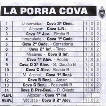 Ya está en marcha la segunda porra del Cova con un donativo de un euro por columna. A día de hoy no ha aparecido ningún acertante y el bote es de 45 euros, si el viernes nadie reclama el premio esta recaudación se acumulará a la próxima jornada.